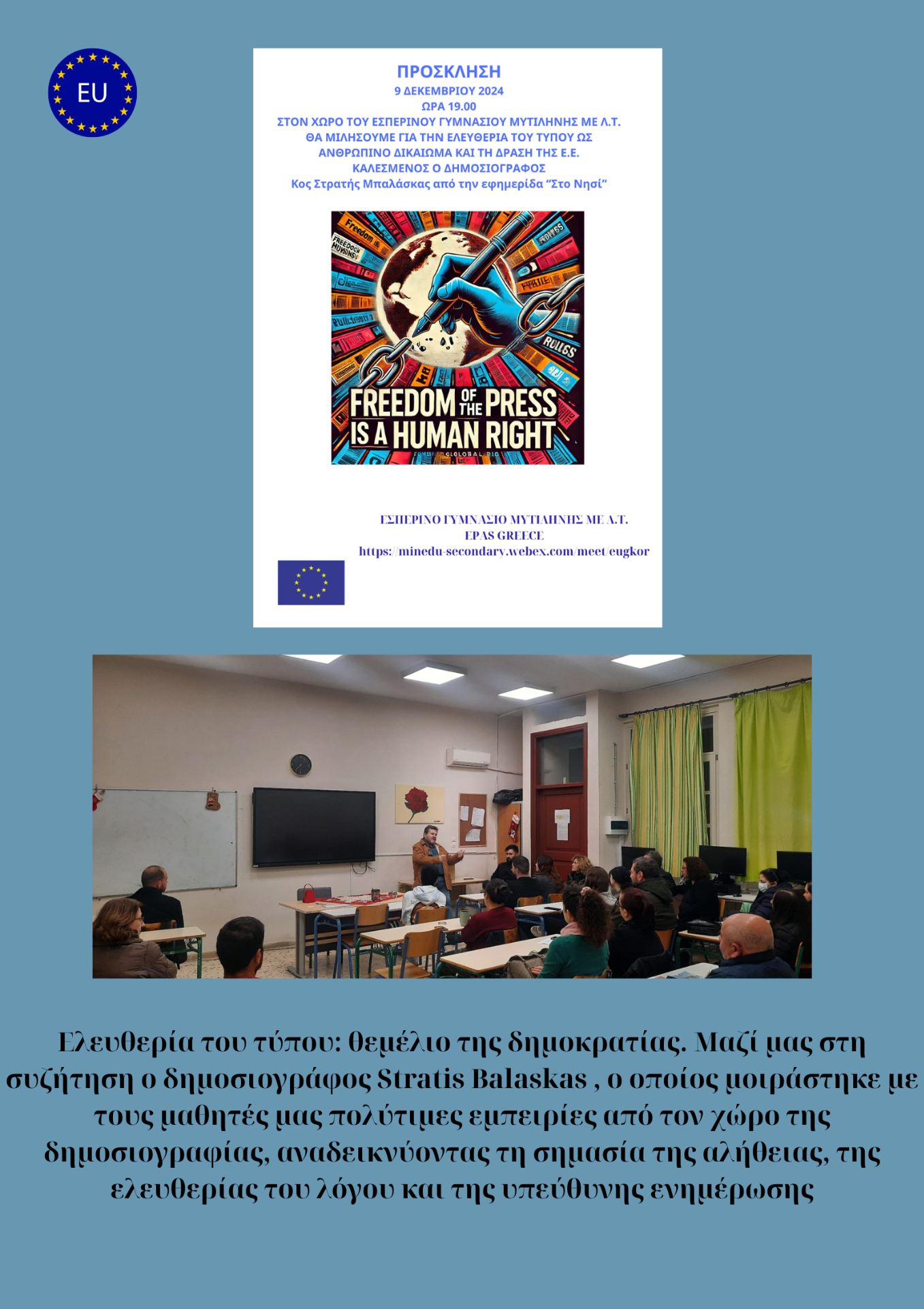 καλεσμένος ο δημοσιογράφος τοπικού τύπου Στρατής Μπαλάσκας από την εφημερίδα Το Νησί, ο οποίος μοιράστηκε με τους μαθητές μας πολύτιμες εμπειρίες από τον χώρο της δημοσιογραφίας, αναδεικνύοντας τη σημασία της αλήθειας. Της ελευθερίας του λόγου και της υπεύθυνης ενημέρωσης