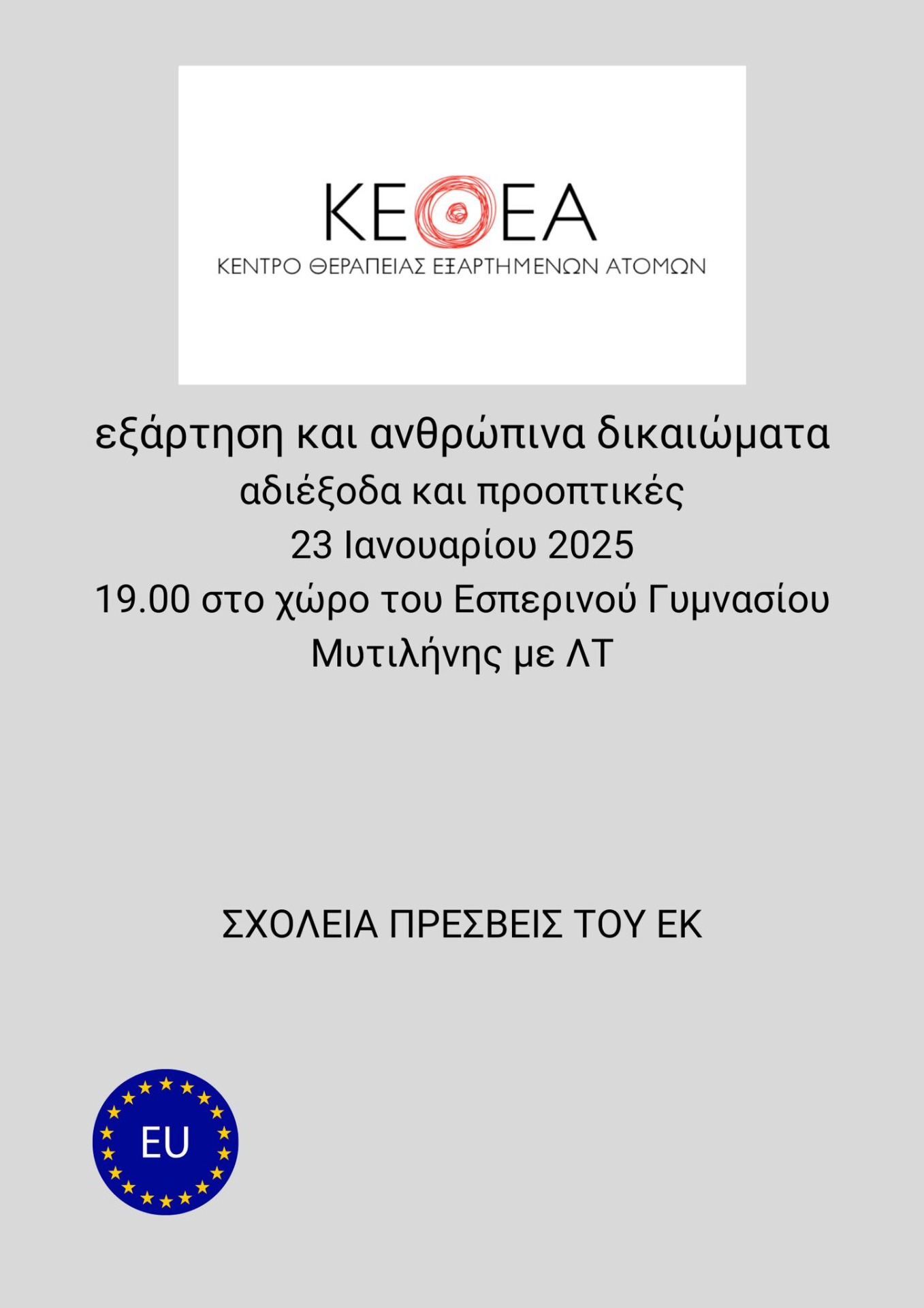 Η στρατηγική της ΕΕ στον τομέα των παράνομων ουσιών βασίζεται στις θεμελιώδεις αρχές του ενωσιακού δικαίου και προασπίζει τις ιδρυτικές αξίες της Ένωσης, όπως ο σεβασμός προς τα ανθρώπινα δικαιώματα, η ισότητα και η αλληλεγγύη. Οι μαθητές ενημερώθηκαν σχετικά από εκπρόσωπο του ΚΕΘΕΑ Μυτιλήνης