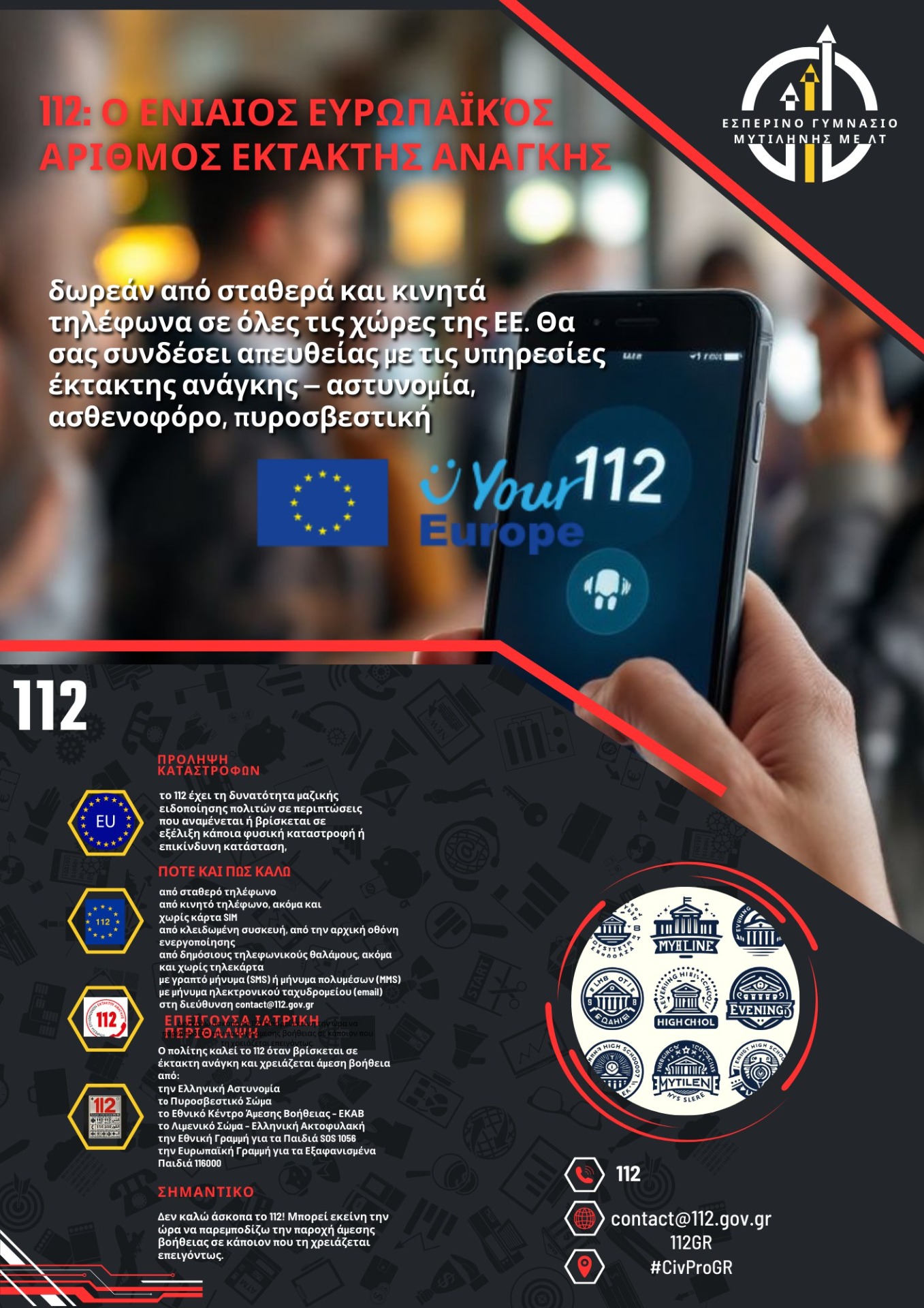 Η Ευρωπαϊκή Ημέρα του αριθμού 112, καθιερώθηκε να εορτάζεται κάθε χρόνο στις 11 Φεβρουαρίου σε όλη την Ευρώπη. Οι junior Ambassadors έφτιαξαν σχετική ενημερωτική αφίσα, η οποία επικολλήθηκε στο φυσικό info point του σχολείου μας, σε άλλα σχολεία της Λέσβου, όπως το Γυμνάσιο Αγίας Παρασκευής και σε καταστήματα της πόλης. Επίσης αναρτήθηκε και στα κοινωνικά δίκτυα του σχολείου.