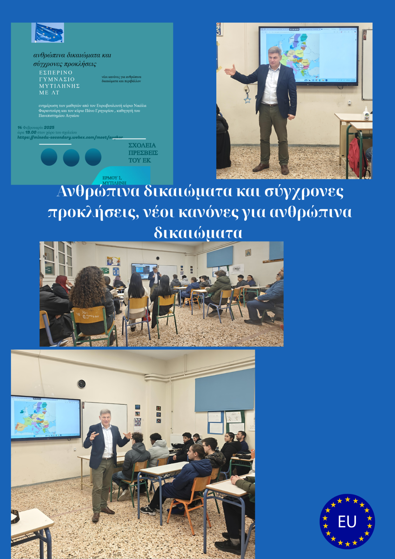 Συμμετοχή του σχολείου μας στη συζήτηση με θέμα : "20 χρόνια από το Σχέδιο Συνταγματικής Συνθήκης και το μέλλον της ΕΕ" στο εμπορικό Επιμελητήριο Λέσβου την Παρασκευή 28 Μαρτίου 2025. Την εκδήλωση διοργάνωσε το Europe Direct Βορείου Αιγαίου με την ευγενική υποστήριξη της Αντιπροσωπείας της Ευρωπαϊκής Επιτροπής στην Ελλάδα.