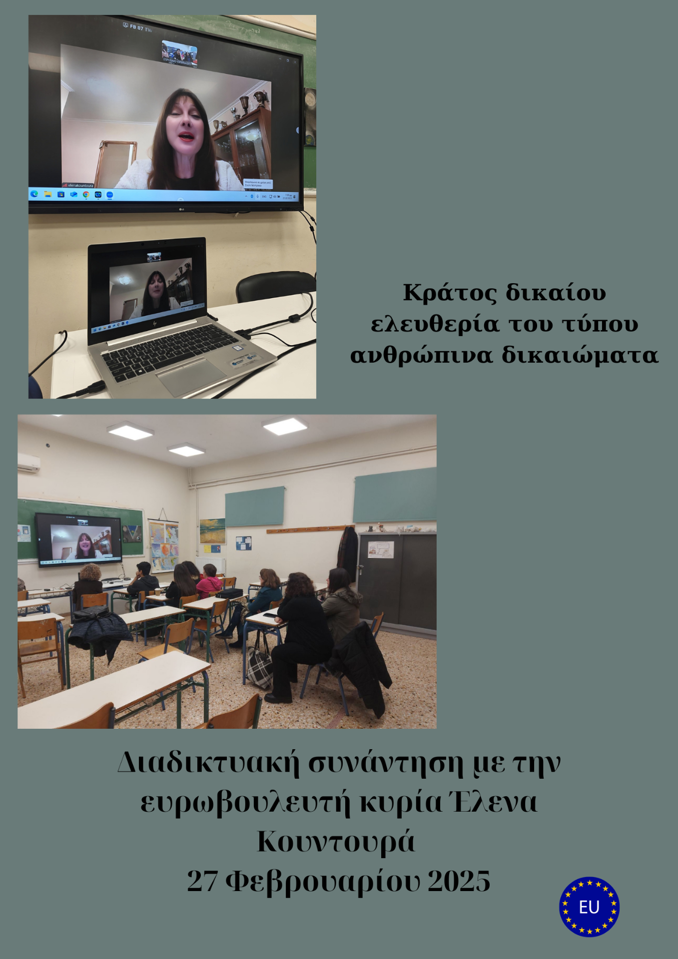 Κράτος Δικαίου, Ανθρώπινα Δικαιώματα & Ελευθερία του Τύπου Διαδικτυακή συνάντηση με την Ευρωβουλευτή κυρία Έλενα Κουντουρά και τους junior ambassadors του προγράμματος. Κράτος Δικαίου & Ανθρώπινα Δικαιώματα Συζητήσαμε τη σημασία της δημοκρατίας, της ισονομίας και της προστασίας των θεμελιωδών δικαιωμάτων σε μια ευρωπαϊκή κοινωνία που εξελίσσεται. Αναλύσαμε τις προκλήσεις που αντιμετωπίζει η χώρα μας και τον ρόλο της Ευρωπαϊκής Ένωσης στην προάσπιση του κράτους δικαίου. Ελευθερία του Τύπου στην Ελλάδα Αναφερθήκαμε στη σημασία της ανεξάρτητης δημοσιογραφίας και της πολυφωνίας ως θεμέλια της δημοκρατίας. Συζητήσαμε για τη θέση της Ελλάδας στις διεθνείς αξιολογήσεις της ελευθερίας του Τύπου και τις δυσκολίες που αντιμετωπίζουν οι δημοσιογράφοι. Διαφορετικές μορφές βίας. Η συζήτηση επεκτάθηκε στις σύγχρονες προκλήσεις που αφορούν τη βία σε όλες τις εκφάνσεις της: έμφυλη βία, διαδικτυακή παρενόχληση, ρατσιστική και θεσμική βία. Δόθηκε έμφαση στην ανάγκη ευαισθητοποίησης και δράσης για την καταπολέμηση κάθε μορφής καταπάτησης των δικαιωμάτων του ανθρώπου.
