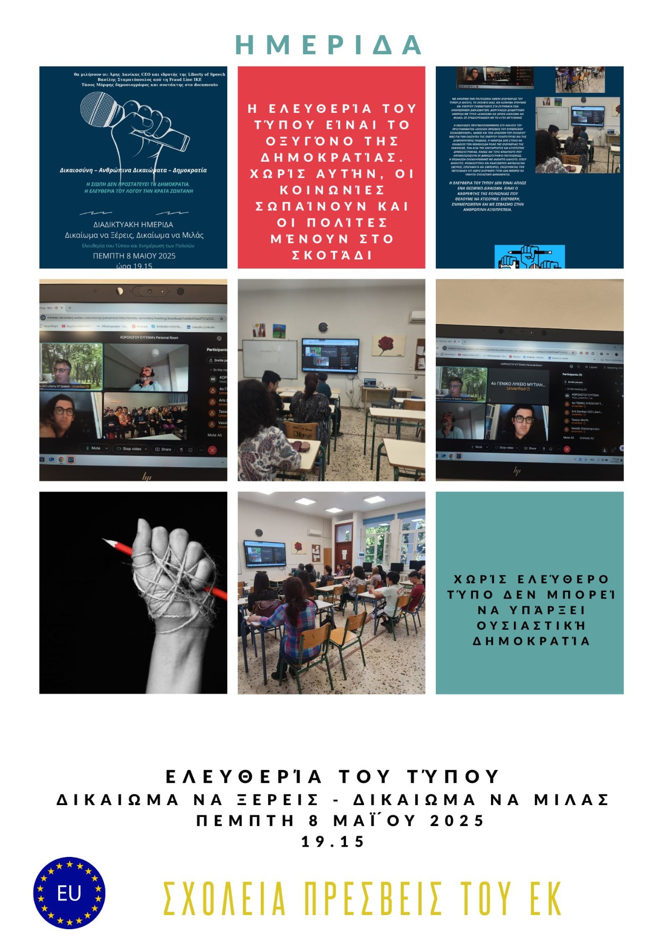 Στο πλαίσιο των εκπαιδευτικών μας δράσεων για το δίκτυο Σχολεία Πρέσβεις του ΕΚ, είχαμε την ευκαιρία να πραγματοποιήσουμε μια διαδικτυακή ημερίδα και συνομιλία με τον έμπειρο δημοσιογράφο Μάνο Σταραμόπουλος, ο οποίος μοιράστηκε μαζί μας πολύτιμες γνώσεις και εμπειρίες σχετικά με την ελευθερία του Τύπου και την απειλή των ψευδών ειδήσεων στην Ελλάδα και την Ευρώπη. Η Ελευθερία του Τύπου: Ένα Θεμελιώδες Δικαίωμα Η ελευθερία του Τύπου αποτελεί βασικό πυλώνα της δημοκρατίας, καθώς επιτρέπει την ελεύθερη διακίνηση πληροφοριών και την ανεξάρτητη δημοσιογραφία. Ωστόσο, στην Ελλάδα και σε αρκετές χώρες της Ευρώπης, αντιμετωπίζει προκλήσεις, όπως η πολιτική και οικονομική πίεση προς τα μέσα ενημέρωσης, η έλλειψη διαφάνειας στη χρηματοδότησή τους και οι επιθέσεις κατά δημοσιογράφων. Ο καλεσμένος μας τόνισε ότι σύμφωνα με διεθνείς εκθέσεις, η Ελλάδα κατατάσσεται χαμηλά στην ελευθερία του Τύπου σε σχέση με άλλες ευρωπαϊκές χώρες, κάτι που καθιστά επιτακτική την ανάγκη προστασίας των δημοσιογράφων και ενίσχυσης της ανεξαρτησίας τους. Fake News: Πώς να τα Αναγνωρίζουμε Μια από τις μεγαλύτερες προκλήσεις της σύγχρονης εποχής είναι η εξάπλωση των ψευδών ειδήσεων (fake news). Ο δημοσιογράφος μας εξήγησε ότι τα fake news χρησιμοποιούνται για τη χειραγώγηση της κοινής γνώμης, τη διασπορά προπαγάνδας και την πρόκληση σύγχυσης στο κοινό.